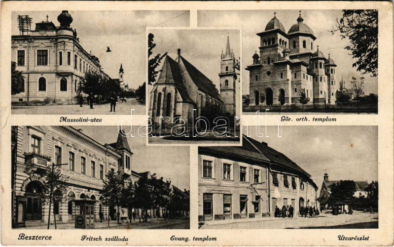 Beszterce, Bistritz, Bistrita; Mussolini utca, Görög ortodox és evangélikus templom, utca, Fritsch szálloda / streets, Greek Ortodox and Lutheran churches, hotel (r)