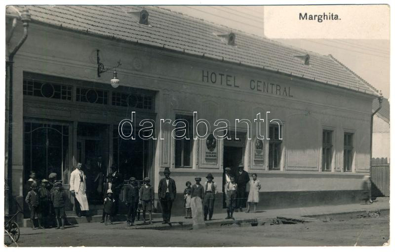 Leírás: Margitta, Marghita; Josif Klein Központi szálloda, vendéglő, sör, bor és pálinka üzlete / Hotel Central, restaurant. photo (EK)