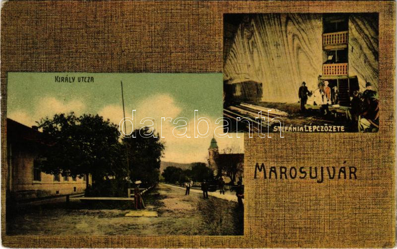 Leírás: Marosújvár, Uioara, Ocna Mures; Király utca, Stefánia bánya lépcsőzete. Grünn Géza kiadása / street view, mine interior (ázott / wet damage)