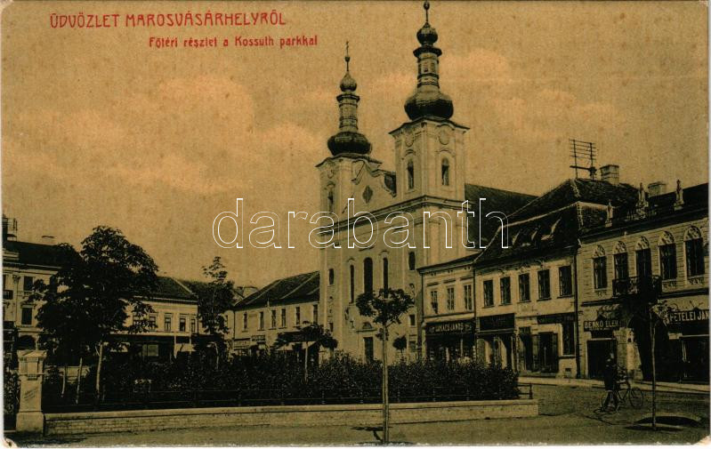 Marosvásárhely, Targu Mures; Fő tér, Kossuth park, Petelei János, Benkő Elek, Lukács János, Schuster és Csiky Emil üzlete, gyógyszertár. W.L. (?) No. 42. / main square, park, shops, pharmacy