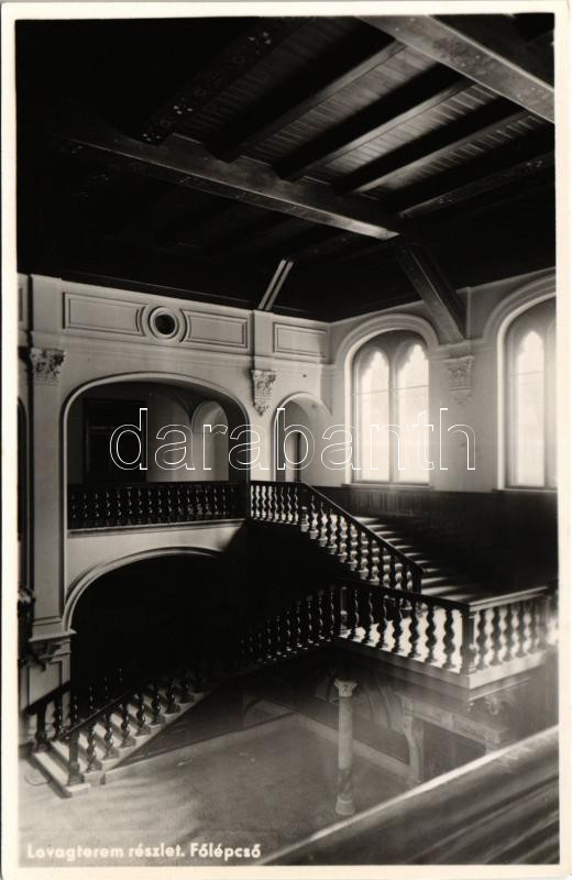 Leírás: Nagykároly, Carei; M. kir. "Gróf Károlyi István" honvéd tiszti fiúnevelő intézet (Károlyi kastély). Főépület, Lovagterem részlet, főlépcső / Hungarian military school, castle, interior (vágott / cut)
