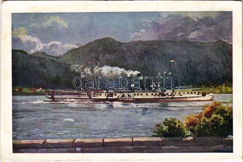 Orsova, I. Ferenc József termesgőzös, oldalkerekes gőzhajó. MFTR Művészlevelezőlap 6314-14. / "I. Ferenc József" Hungarian sidewheeler passenger steamer - képeslapfüzetből / from postcard booklet