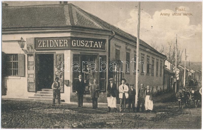 Piski, Simeria; Arany utca sarok, Zeidner Gusztáv üzlete. Adler fényir... https://www.darabanth.com/hu/437-Gyorsarveres/437.0/Kepeslapok/Erdely~1500006/Piski-Simeria-Arany-utca-sarok-Zeidner-Gusztav-uzlete-Adler-fenyirda-Lupeny-street-view-wi~II1573230