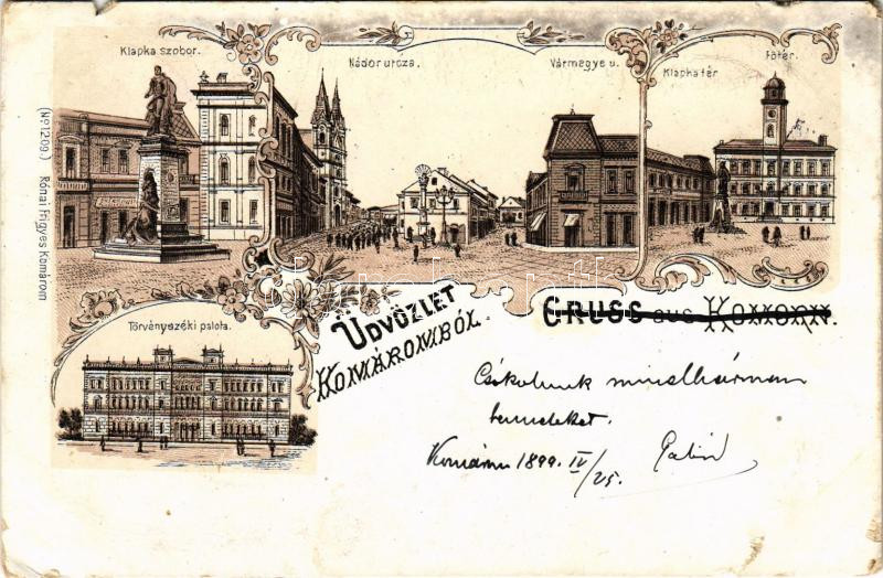 1899 (Vorläufer) Komárom, Komárno; Klapka tér és szobor, Városháza, Fő tér, Nádor utca, Vármegye utca, Törvényszéki palota / square, statue, town hall, street view, court. Art Nouveau, floral, litho (szakadások / tears)