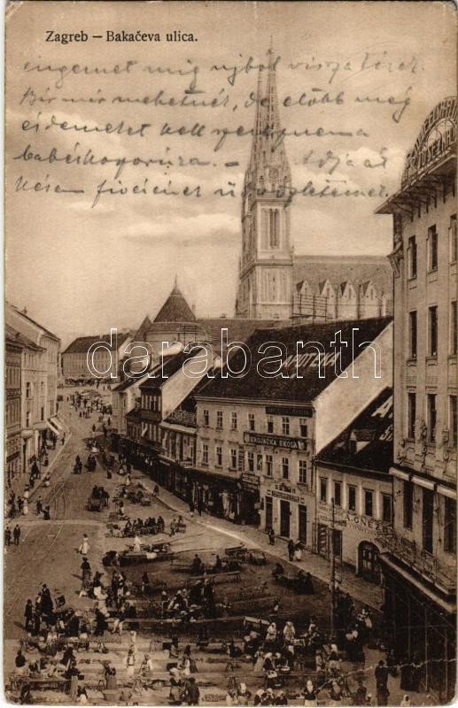 1914 Zágráb, Zagreb; Bakaceva ulica, Apoteka, Krojacka Skola, Kaptolska Ljekarna / utcakép, Gyógyszertár, iskola, piaci árusok, autógarázs, üzletek / street view with pharmacy, school, market vendors, auto garage and shops (EB)