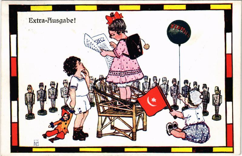 1916 Extra-Ausgabe, Zeppelin. Unsere KInder im Weltkriege / Első világháborús katonai propaganda, gyerekek, török zászló / WWI military propaganda, children, Turkish flag. B.W.K.W. VI/2. Nr. 31-1916. s: M.S.