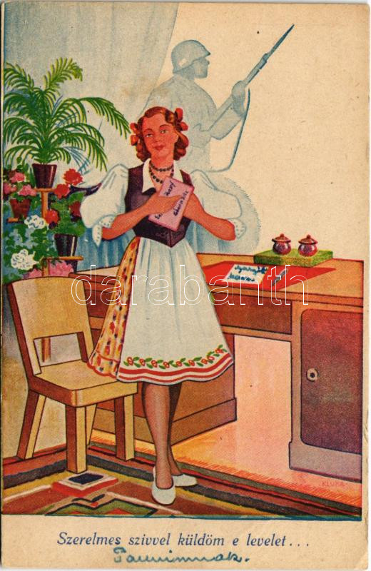 Leírás: "Szerelmes szívvel küldöm e levelet..." Magyar katonai művészlap / Hungarian military art postcard s: Kluka (EB)
