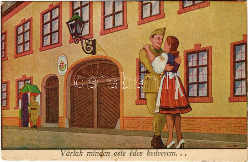 Leírás: "Várlak minden este édes kedvesem..." Magyar katonai művészlap / Hungarian military art postcard, soldier with lady s: Kluka (fa)