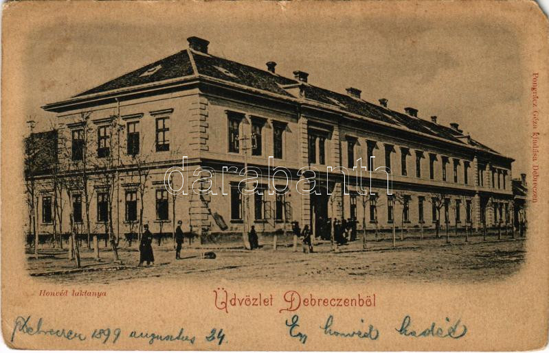 1899 (Vorläufer) Debrecen, Honvéd laktanya. Pongrácz Géza kiadása (EM) https://www.darabanth.com/hu/437-Gyorsarveres/437.0/Kepeslapok/Magyarorszag~1500005/1899-Vorlaufer-Debrecen-Honved-laktanya-Pongracz-Geza-kiadasa-EM~II2851522