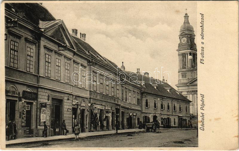 Leírás: 1906 Pápa, Fő utca, városháza, Takarékpénztár, Mayer A., Schlosszer István és Gergely Nándor üzlete. Mayer Adolf saját kiadása (EK)
