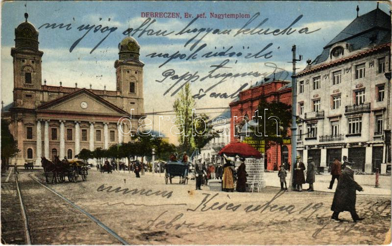 1913 Debrecen, Református nagytemplom, piac, hirdetőoszlop (EK) https://www.darabanth.com/hu/437-Gyorsarveres/437.0/Kepeslapok/Magyarorszag~1500005/1913-Debrecen-Reformatus-nagytemplom-piac-hirdetooszlop-EK~II2852595