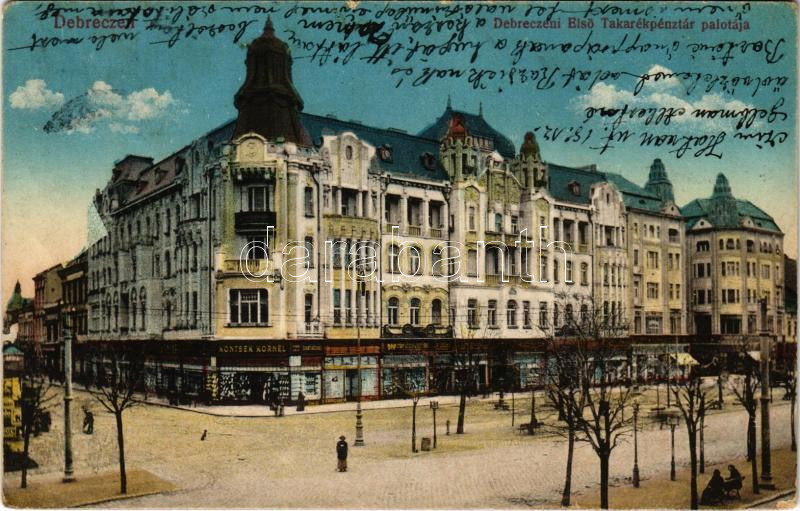 Leírás: 1916 Debrecen, Debreczeni Első Takarékpénztár palotája, Kontsek Kornél üzlete (Rb)