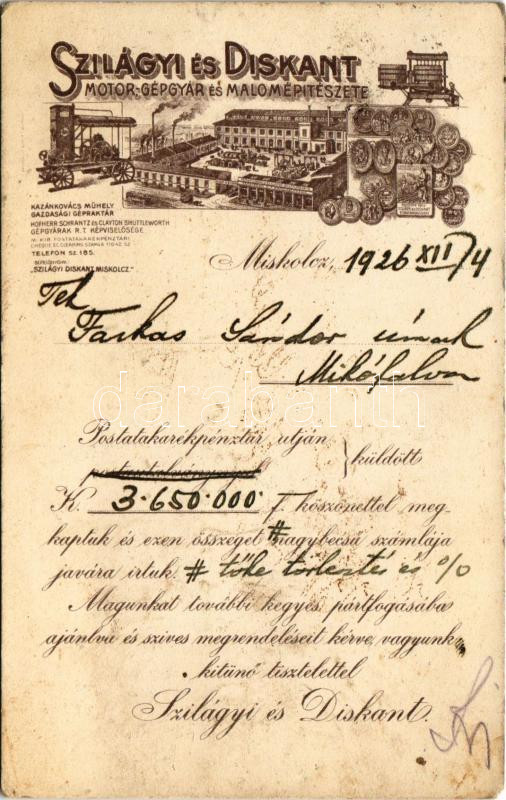 1926 Miskolc, Szilágyi és Diskant Motor.-Gépgyára és malomépítészete, ... https://www.darabanth.com/hu/437-Gyorsarveres/437.0/Kepeslapok/Magyarorszag~1500005/1926-Miskolc-Szilagyi-es-Diskant-Motor-Gepgyara-es-malomepiteszete-reklam-EK~II2843778