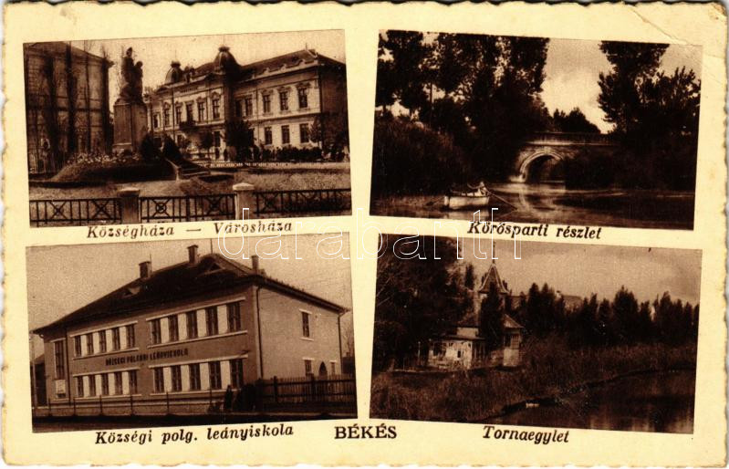1939 Békés, Községháza, Városháza, Körös-parti részlet, Községi polgár... https://www.darabanth.com/hu/437-Gyorsarveres/437.0/Kepeslapok/Magyarorszag~1500005/1939-Bekes-Kozseghaza-Varoshaza-Koros-parti-reszlet-Kozsegi-polgari-leanyiskola-T~II2844239