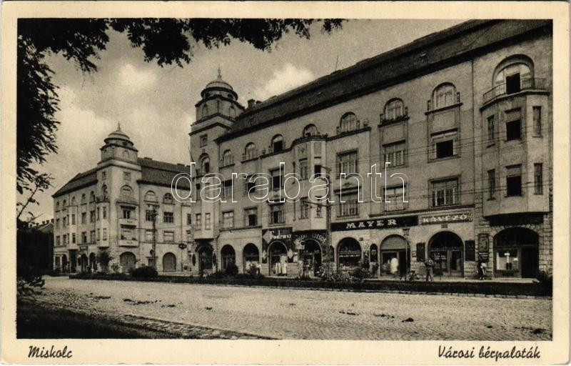 Leírás: 1940 Miskolc, Városi bérpaloták, Mayer kávézó, fodrász, dohány tőzsde, üzletek