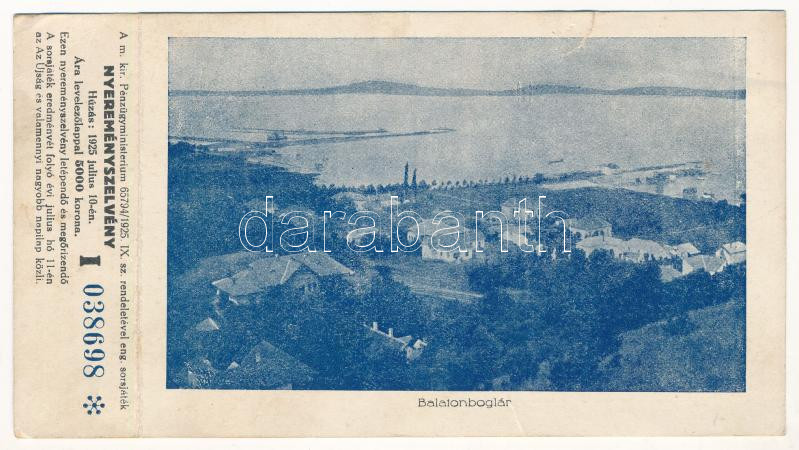 Balatonboglár. A Balatoni Társaság sorsjáték nyereményszelvénye, "Budapest legszebb szórakozóhelye Dénes Gy. Aladár éttermei és kávéháza a Sziget Klub-ban" reklám a hátoldalon (szakadás / tear)