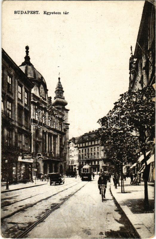 Budapest V. Egyetem tér, villamos, kerékpáros, Szabó Vilmos és köszörű... https://www.darabanth.com/hu/437-Gyorsarveres/437.0/Kepeslapok/Magyarorszag~1500005/Budapest-V-Egyetem-ter-villamos-kerekparos-Szabo-Vilmos-es-koszorus-uzlet-Vasuti-leve~II2851271