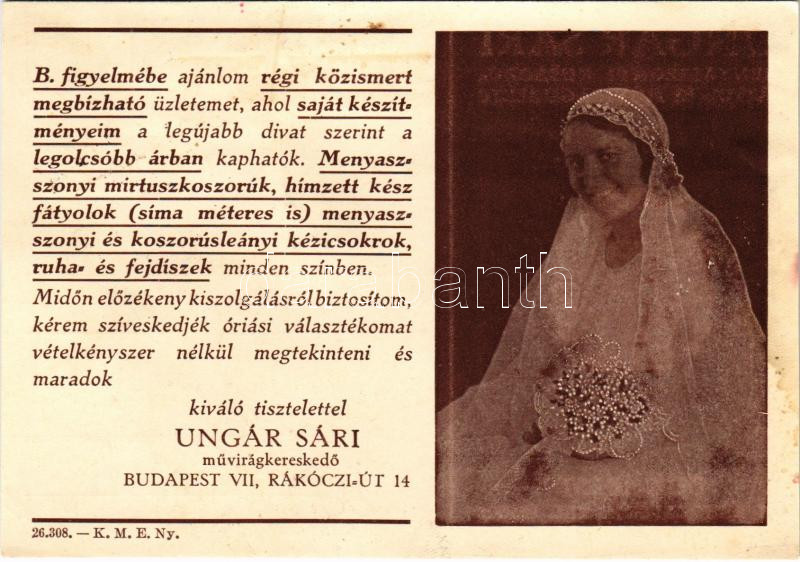 1938 Ungár Sári művirág kereskedő, menyasszonyi koszorú, fátyol- és mű... https://www.darabanth.com/hu/437-Gyorsarveres/437.0/Kepeslapok/Reklam~1500110/1938-Ungar-Sari-muvirag-kereskedo-menyasszonyi-koszoru-fatyol-es-muvirag-uzlet-reklam~II2853324
