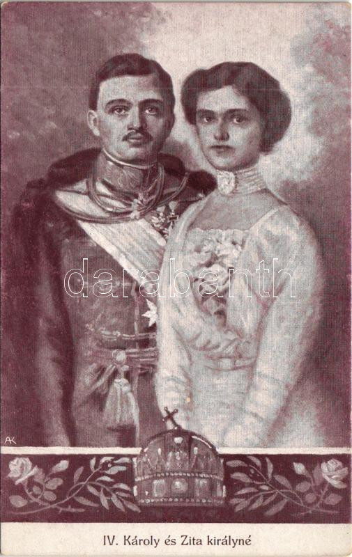 IV. Károly és Zita királyné. B.K.W.I. https://www.darabanth.com/hu/437-Gyorsarveres/437.0/Kepeslapok/Uralkodo-Politikus~1500100/IV-Karoly-es-Zita-kiralyne-BKWI~II2838957