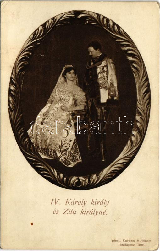 IV. Károly király és Zita királyné. Phot. Kardos Műterem, Budapest 191... https://www.darabanth.com/hu/437-Gyorsarveres/437.0/Kepeslapok/Uralkodo-Politikus~1500100/IV-Karoly-kiraly-es-Zita-kiralyne-Phot-Kardos-Muterem-Budapest-1916-Charles-I-of-Austri~II2853831