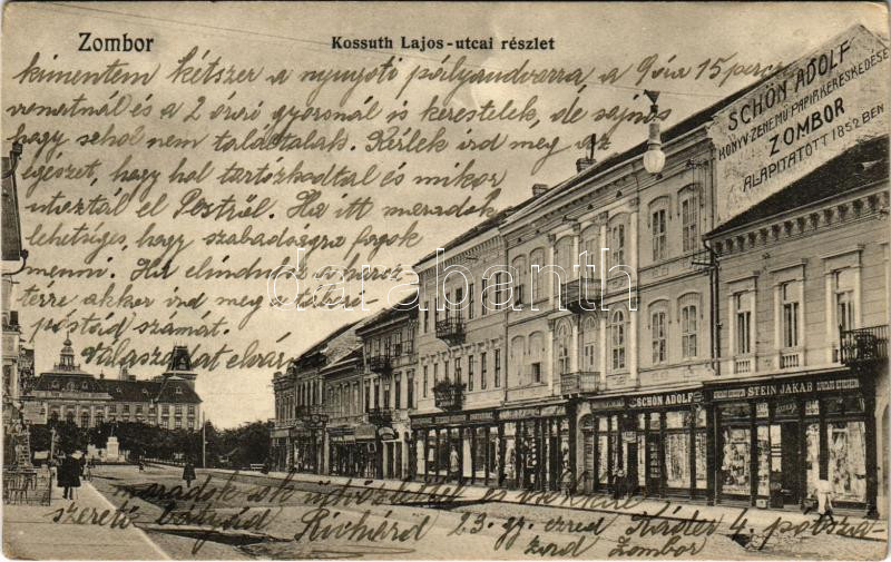 1914 Zombor, Sombor; Kossuth Lajos utca, Schön Adolf könyv, zenemű és papírkereskedés, Stein Jakab, Matusek Béla, Spitzer Sándor és Stehler Antal üzlete. Schön Adolf saját kiadása / street, shops (EK)