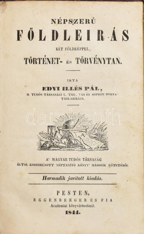 Edvi Illés Pál: Népszerű földleírás két földképpel, történet- és törvénytan. Pest, 1844., Eggenberger és Fia, 118 p. Térkép nélkül. Korabeli kartonált papírkötés, szennyalapok nélkül, egy lapon firkával, az utolsó lap szakadt.