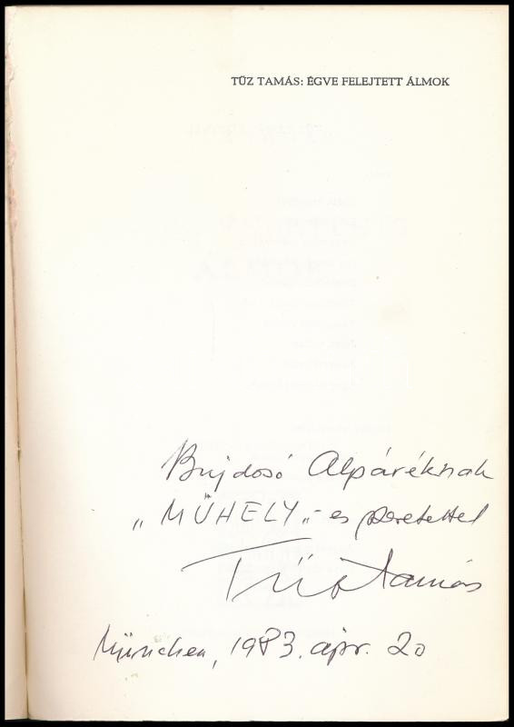 Tűz Tamás Égve felejtett álmok. A szerző, Tűz Tamás (1916-1992) író, költő által Bujdosó Alpár (1935-2021) költő, mérnök, a Magyar Műhely szerkesztője a magyar avantgarde kiemelkedő alakja részére DEDIKÁLT példány. Amerikai Magyar Írók. München, 1980., Herp Kiadó. Emigráns kiadás. Kiadói papírkötés.