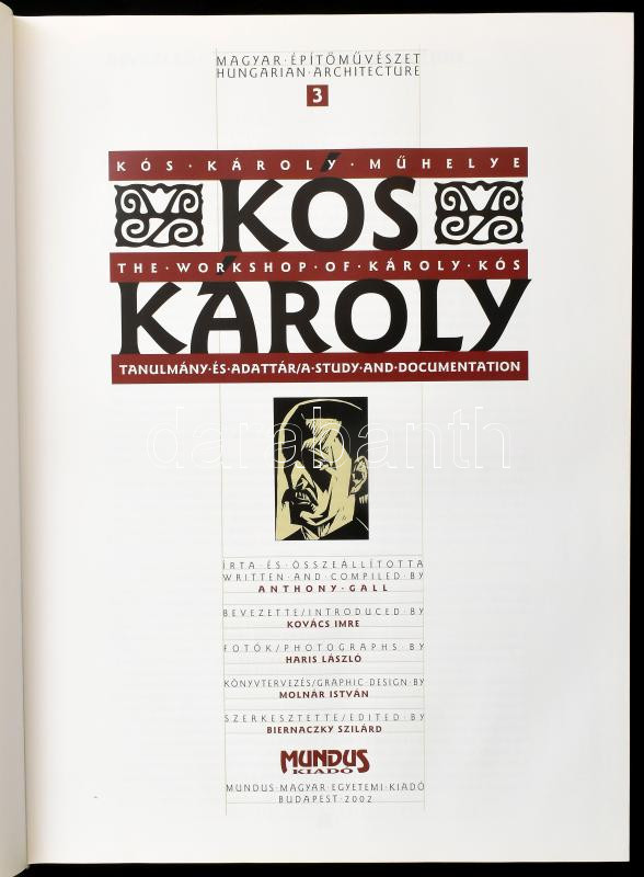 Anthony Gall: Kós Károly. Írta és összeáll. - -. Kovács Imre bevezetésével. Haris László fotók. Szerk.: Biernaczky Szilárd. Magyar Építőművészet 3. Bp., 2002., Mundus Magyar Egyetemi Kiadó. Magyar és angol nyelven. Gazdag képanyaggal illusztrált. Kiadói kartonált papírkötés.