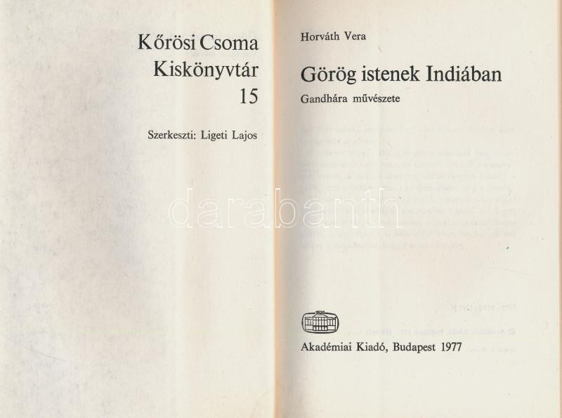 Horváth Vera: Görög Istenek Indiában. Gandhára művészete. KÅ‘rösi Csoma Kiskönyvtár 15. Bp., 1977., Akadémiai Kiadó, 167+1 p + 12 (kétoldalas fekete-fehér képtáblák, közte egy térképvázlattal) t. ElsÅ‘ kiadás. Kiadói papÃrkötés. Megjelent 1000 példányban.