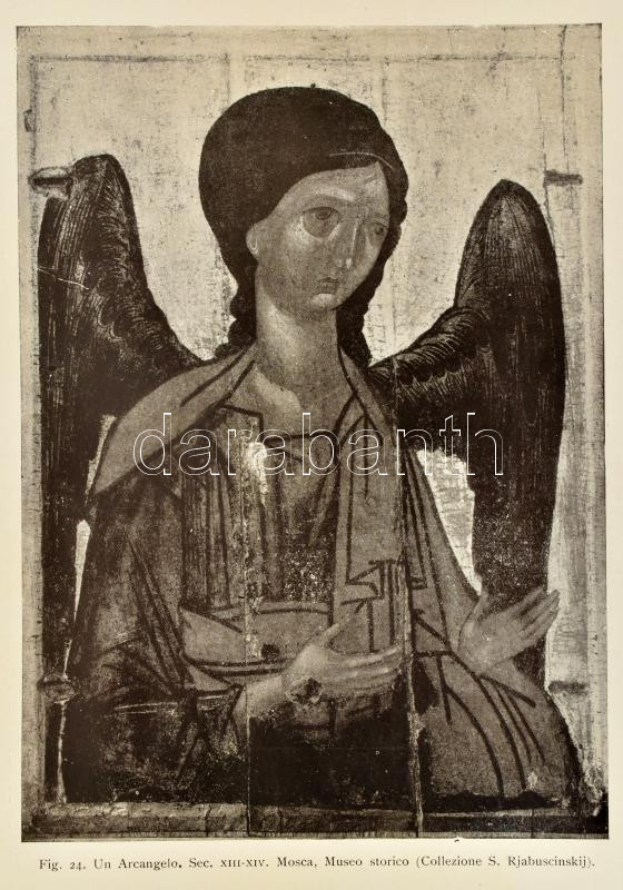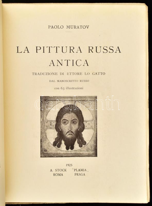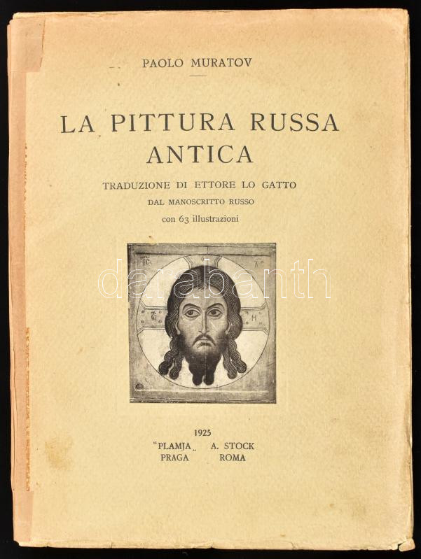 [Muratov, Pavel Pavlovich] Paolo Muratov: La pittura russa antica. Traduzione di Ettore Lo Gatto dal manoscritto russo. Roma-Praga, 1925, A. Stock - Plamja, 166+(1) p. Szövegközi és egészoldalas, fekete-fehér képekkel illusztrálva. Olasz nyelven. Kiadói papírkötés, sérült, javított gerinccel, a könyvtesttől elvált borítóval, szétváló fűzéssel. Számozott (346.) példány.