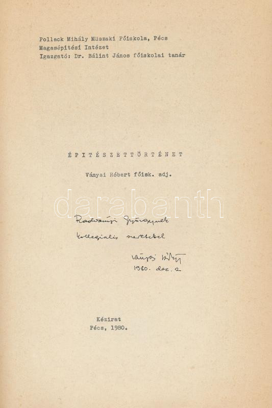 Ványai Róbert: Építészettörténet. A szerző, Ványai Róbert által Radványi György (1949-2020) Ybl Miklós-díjas építőművész részére DEDIKÁLT példány. Pécs, 1980., Pollack Mihály Műszaki Főiskola Magasépítészeti Intézet. Kiadói félvászon-kötés. Megjelent 180 példányban.