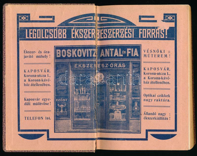 1908 Somogyvármegye Almanachja 1908. III. évf. Kaposvár, Részvénynyomda, 4+253 p.+LXIV t.+ 3 t. Korabeli reklámokkal. Kiadói kissé kopott kartonált papírkötés.