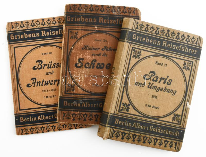 3 db német nyelvű útikönyv: Paris und Umgebung; Kleiner Führer durch die Schweiz; Brüssel und Antwerpen. Griebens Reiseführer Band 21., 24., 84. Berlin, 1905-1915, Albert Goldschmidt. Kihajtható térképekkel. Kiadói egészvászon-/papírkötés, vegyes, kissé viseltes állapotban.