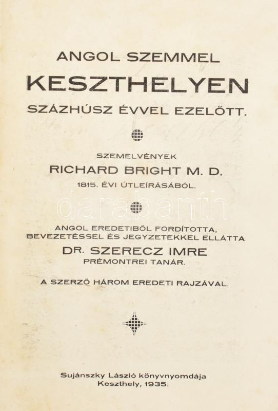 Angol szemmel Keszthelyen százhúsz évvel ezelőtt. Szemelvények Richard Bright 1815. évi útleírásából. Angol eredetiből ford., bev. és jegyzetekkel ellátta Dr. Szerecz Imre. A szerző három eredetib rajzával. Keszthely, 1935, Sujánszki László könyvnyomdája. 78+1p. Kiadói papírkötés, sérült gerinccel, foltos és kissé sérült borítóval, előzéklapon korabeli ajándékozási sorokkal.