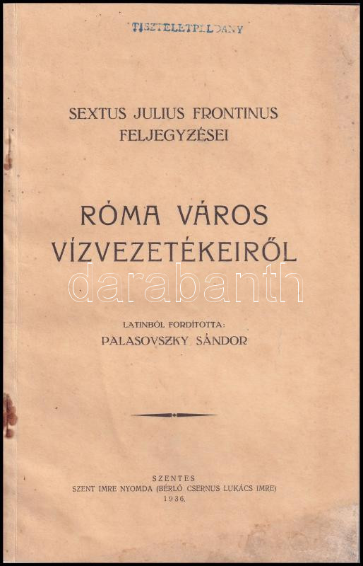 Sextus Julius Frontinus feljegyzései Róma város vízvezetékeiről. Latinból fordította: Palasovszky Sándor. Szentes, 1936, Szent Imre Nyomda. Kiadói foltos papírkötés, kissé kopottas állapotban.