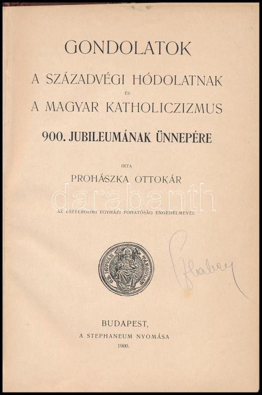 Prohászka Ottokár: Gondolatok a századvégi hódolatnak és a magyar katholicizmus 900. jubileumának ünnepére. Bp., 1900, Stephaneum, 84+4 p. Korabeli átkötött aranyozott félvászon-kötésben, kopott borítóval, ceruzás bejelölésekkel.