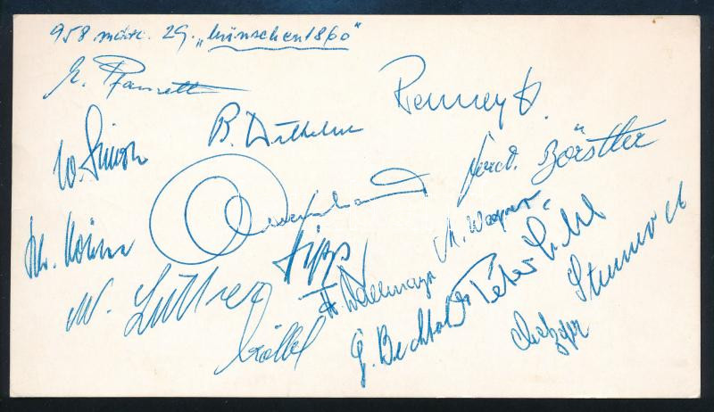 1958 Az Műnchen 1860 és a Rapid labdarúgó csapatok tajai által aláírt meghívó a Vasas és Újpesti Dózsa elleni mérkőzések alkalmábol tartott vacsorára / 1958 Autograph signatures of the München 1860 and the Rapid football players