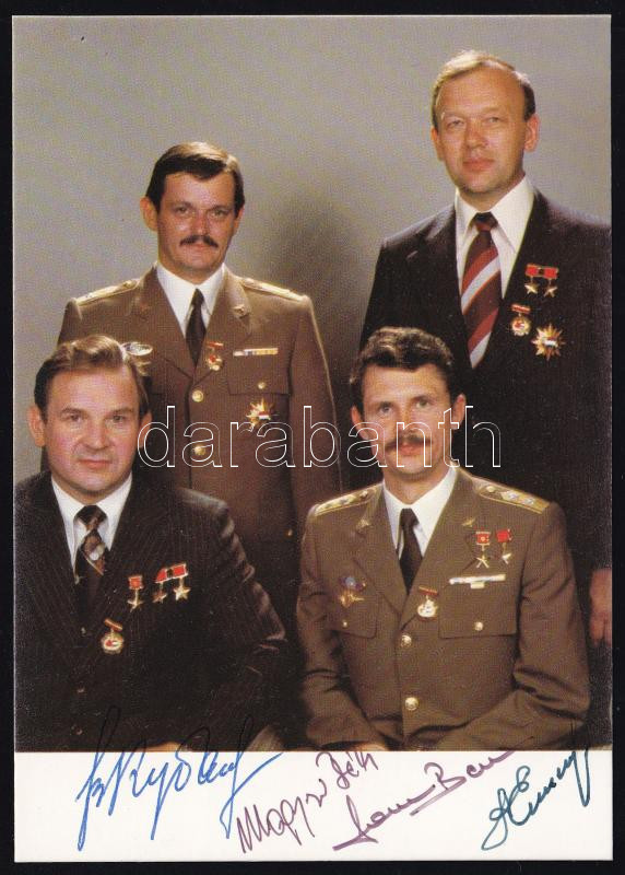 1980 Szovjet-Magyar közös űrrepülés FDC Farkas Bertalan (1949-), Magyari Béla (1949-2018) magyar és Valerij Kubaszov (1935-2014), Alekszej Jeliszejev (1934- ) szovjet űrhajósok aláírásával / Intercosmos FDC with original autograph of 4 astronauts