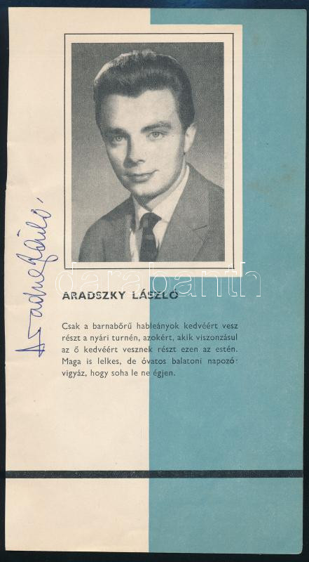 Leírás: Aradszky László (1935-2017) táncdalénekes autográf aláírása az őt bemutató képen