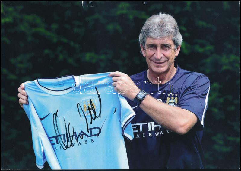 Manuel Pellegrini (1953- ) labdarúgóedző, a Real Madrid és a Manchester City volt vezetőedzőjének autográf aláírása őt ábrázoló fotón (szélén kisebb sérüléssel), tanúsítvánnyal, 29,5x21 cm / Manuel Pellegrini football manager, former head coach of Real Madris and Manchester City, autograph signed photo (slightly damaged on the edge), with certificate