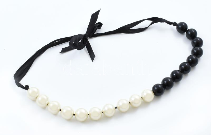 Leírás: Fekete-fehér gyöngysor selyemszalagon, h: 80 cm