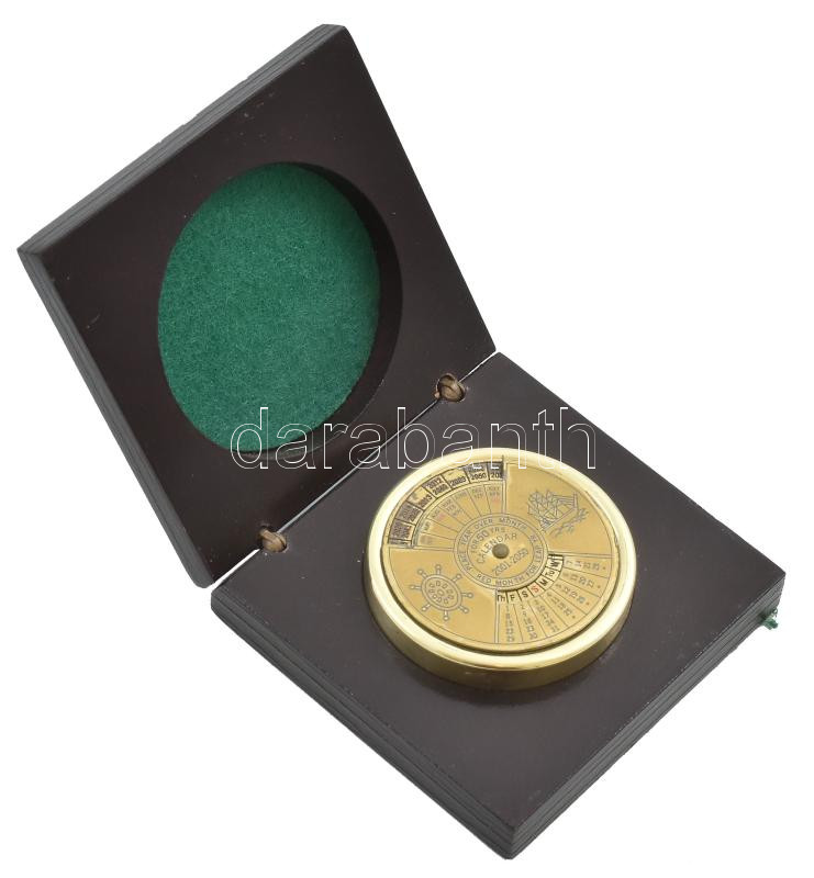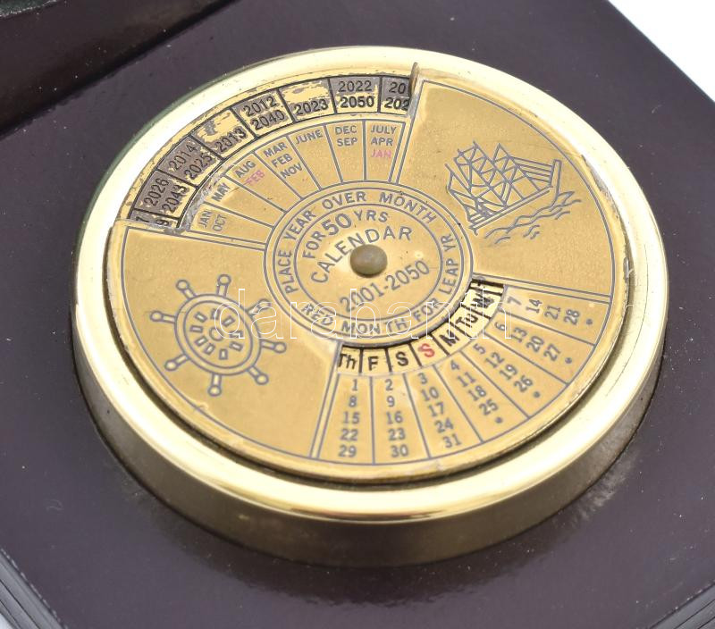 Leírás: Öröknaptár 2001-2050, réz, fa tokkal, hajókormány és vitorlás motívumokkal, a fedél tetején reklámfelirattal, némi kopással, 8,5x8,5 cm