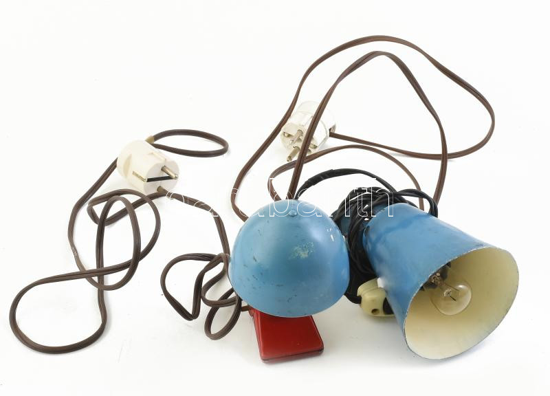 Csíptetős lámpa, 2 db. Vintage fém csíptetős olvasólámpák, egyik kék fix búrájú, másik piros korpuszon kék gomba árnyékolóval, jó kábelezéssel-kapcsolóval, égőkkel, működnek. Kopásokkal. 14cm