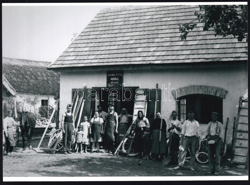 1934 Sári (Pest megye, Dabasi járás), Zsolnai Péter kovácsmester segédeivel és háza népével, képmezőn belül feliratozva, Lőcsei Árpád kecskeméti vándorfényképész hagyatékából 1 db modern nagyítás, 15x21 cm