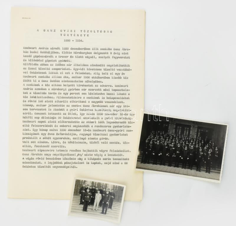 cca 1930-40 MÁVAG Önkéntes Tűzoltóság alakulása, 2 db csoportkép a MÁVAG Művelődési Ház előtt (Bp., Golgota u. 3.), jelzés nélkül, 6x8 és 9x13,5 cm + Ganz Gyári tűzoltóság története 1860-1914, sokszorosított gépirat + történelmi visszapillantás, sokszorosított gépirat + 1985 Fővárosi VIII. ker. Tűzoltóparancsnokság irat