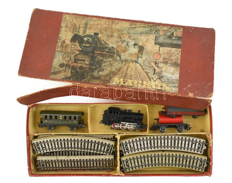 Vintage Märklin vasútmodell (mozdony, 3 db szerelvény, sínek), kopásokkal, eredeti, sérült dobozában, 42x17x5 cm / Vintage Märklin model railway (locomotive, 3 carriages, tracks), with some wear, in original, damaged box