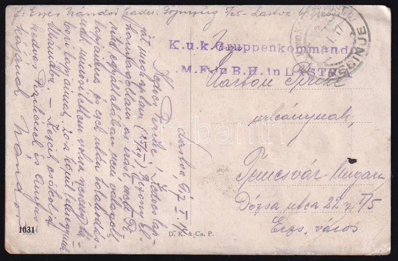 Leírás: 1917 I világháborús tábori posta K.u.k. Gruppenkommando M.F. in B.H. in Lastva bélyegzőjével, Trebinjéből Temesvárra küldve.