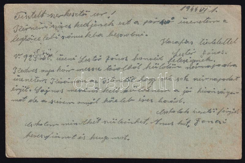 1944 tábori postai levelezőlap II. világháború idejéből, az Orosházai Friss Hírek kiadó hivatalának küldve, amelyben kéri egy honvéd, hogy jelentessék meg névnapi üdvözlő sorait az újságban.
