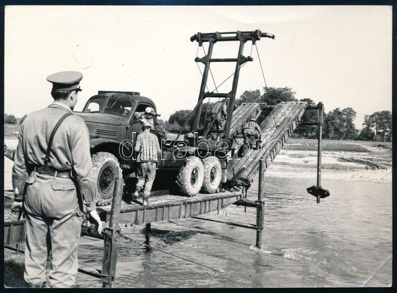 Leírás: cca 1960-1970 Katonai művelet, pontonhíd telepítése teherautóval, fotó, 18x13 cm