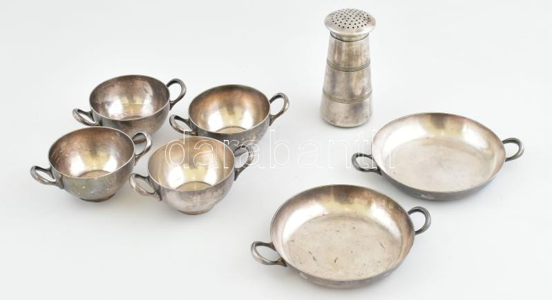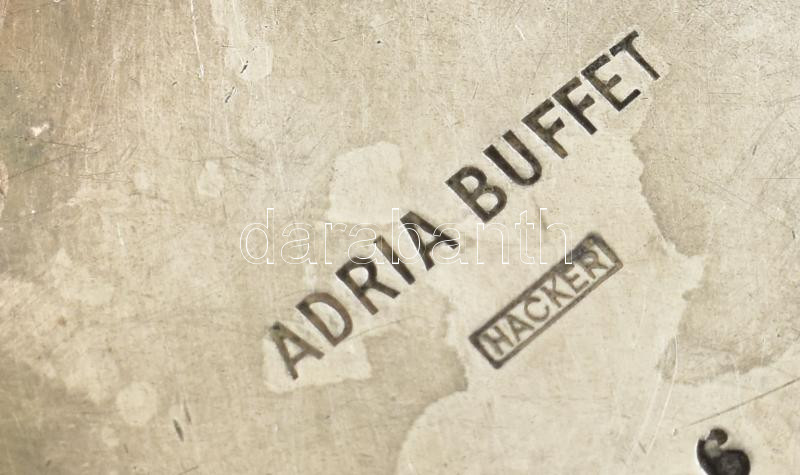 Adria Buffet 1913 szervizéből számazó tárgyak gyűjteménye. Ezüstözött alpakka tálkák (8, 13 cm), cukortartó. Jelzettek (Hacker és Társa), feliratozottak. Az Adria szállóban nyílt meg 1913-ban az első budapesti önkiszolgáló gyorsétterem 41 automatával. Ipartörténeti különlegesség